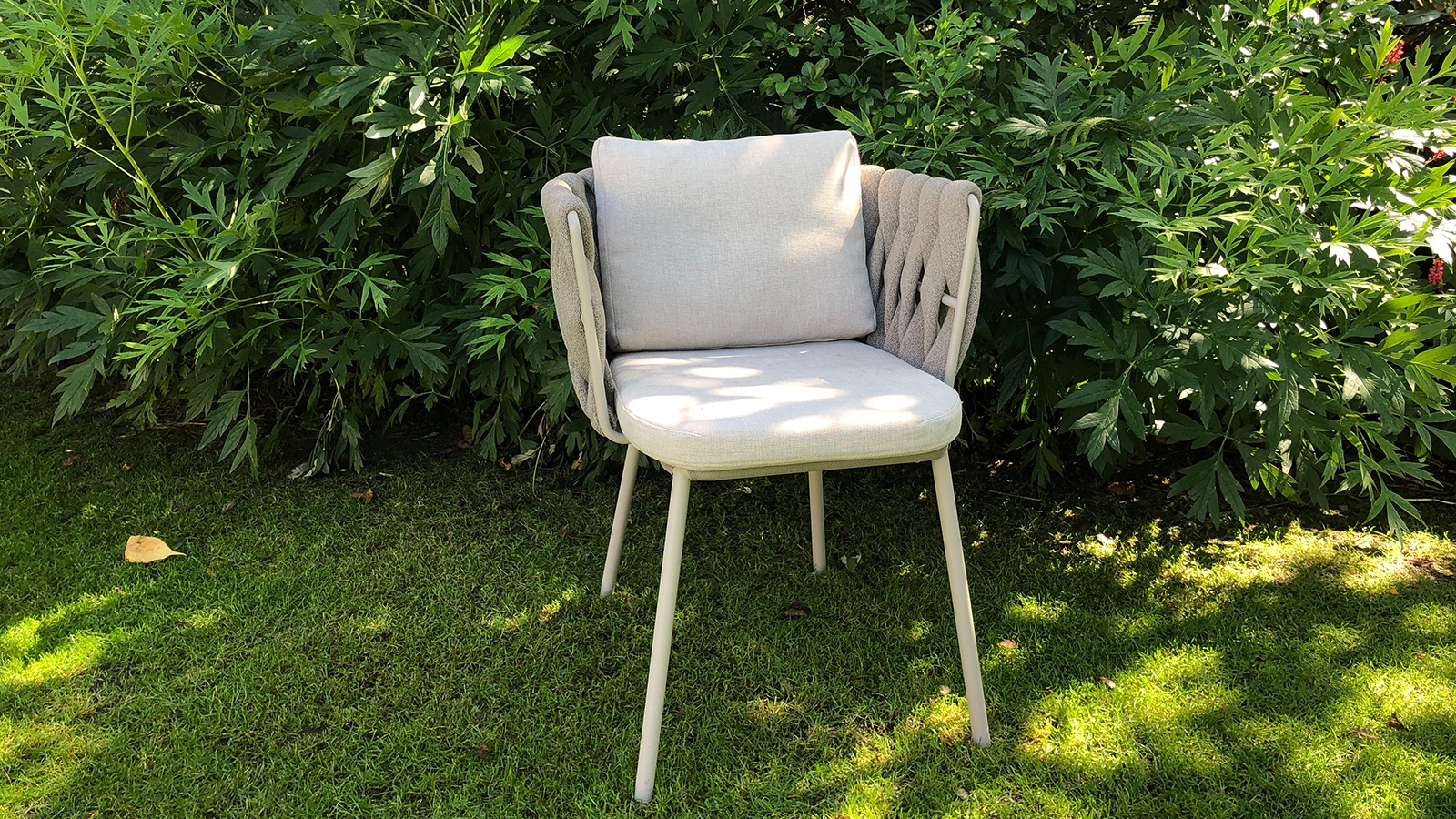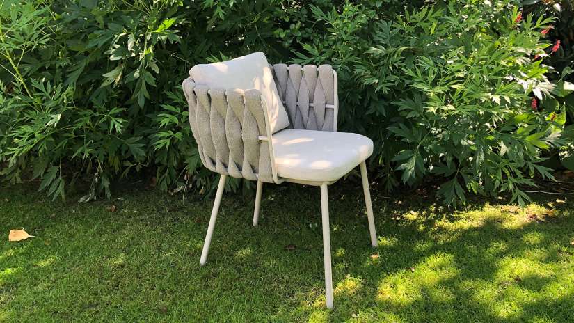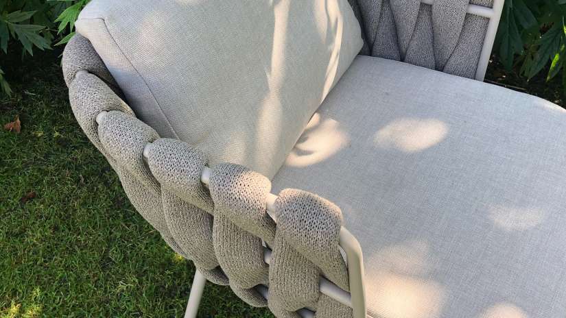 Armstoel in linnenkleur met dikke weving. Incl. zit- en rugkussen in linnenkleur